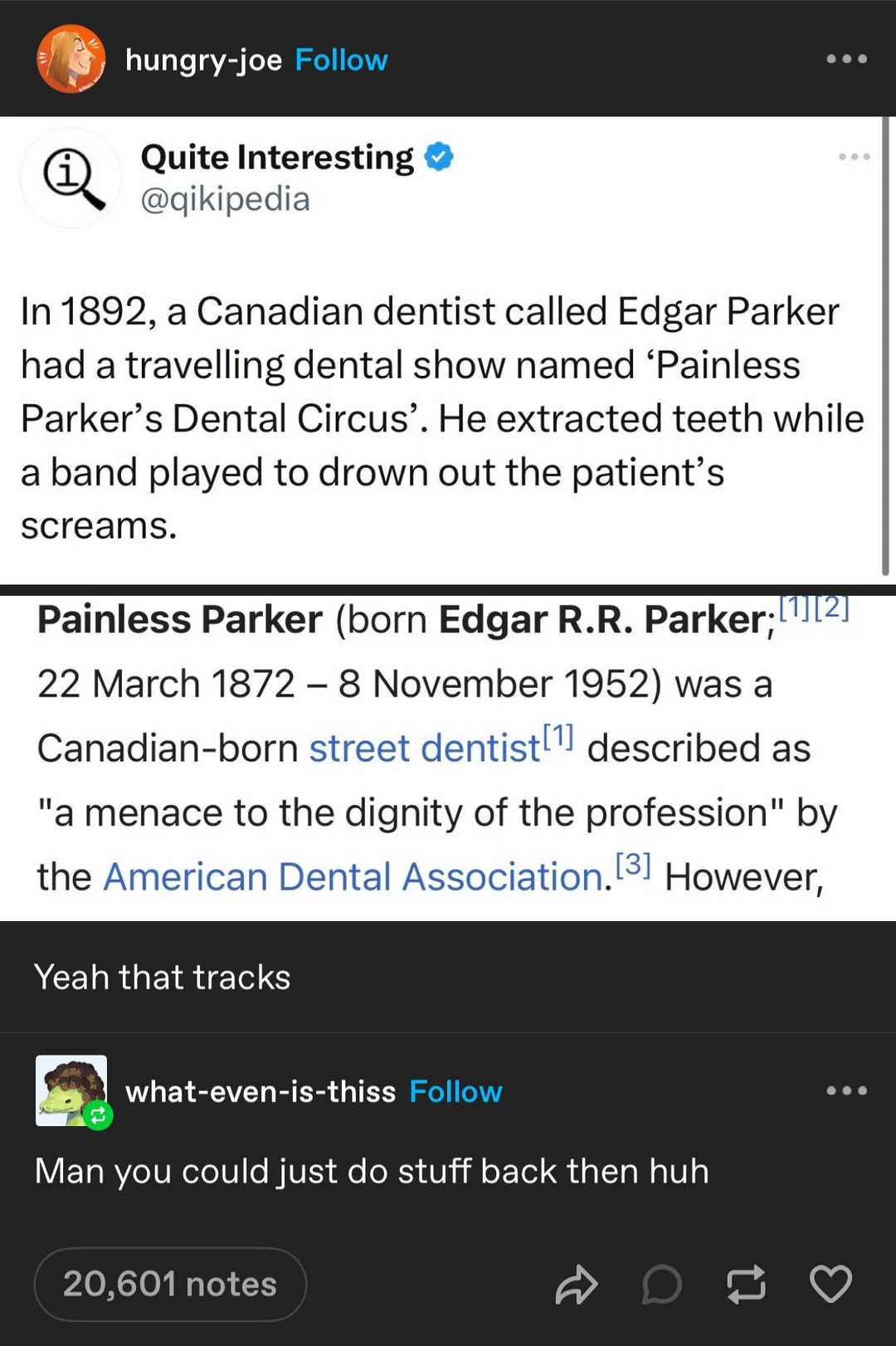 That’s also where the concept of a “barbershop quartet” came from. Dentists would have the aforementioned quartet singing loudly outside of their shop to drown out the screaming of patients inside.
